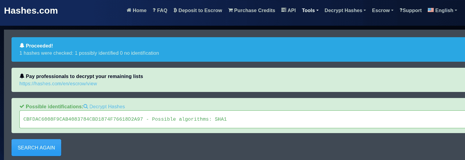 We follow the same approach as before, but the hash is changed from MD5 to SHA1. You can find the hash identifier by using this website.