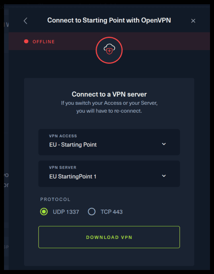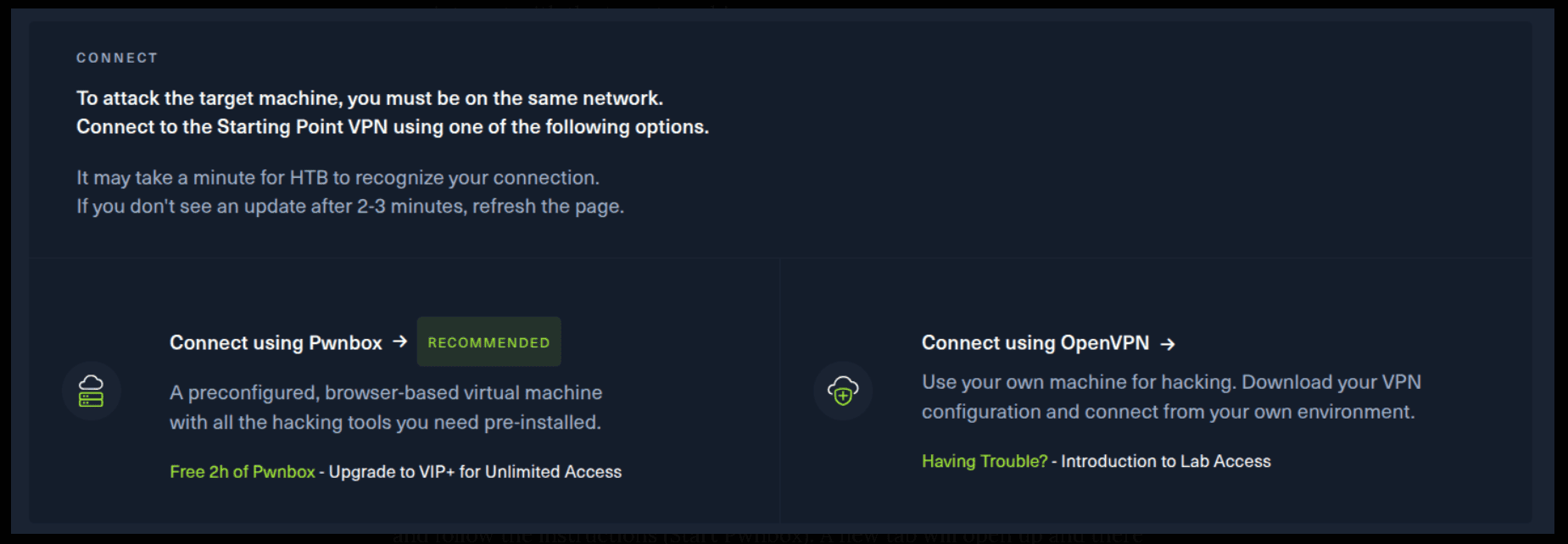 There are 2 options available to connect to our machine. First using Pwnbox or secondly using OpenVPN.